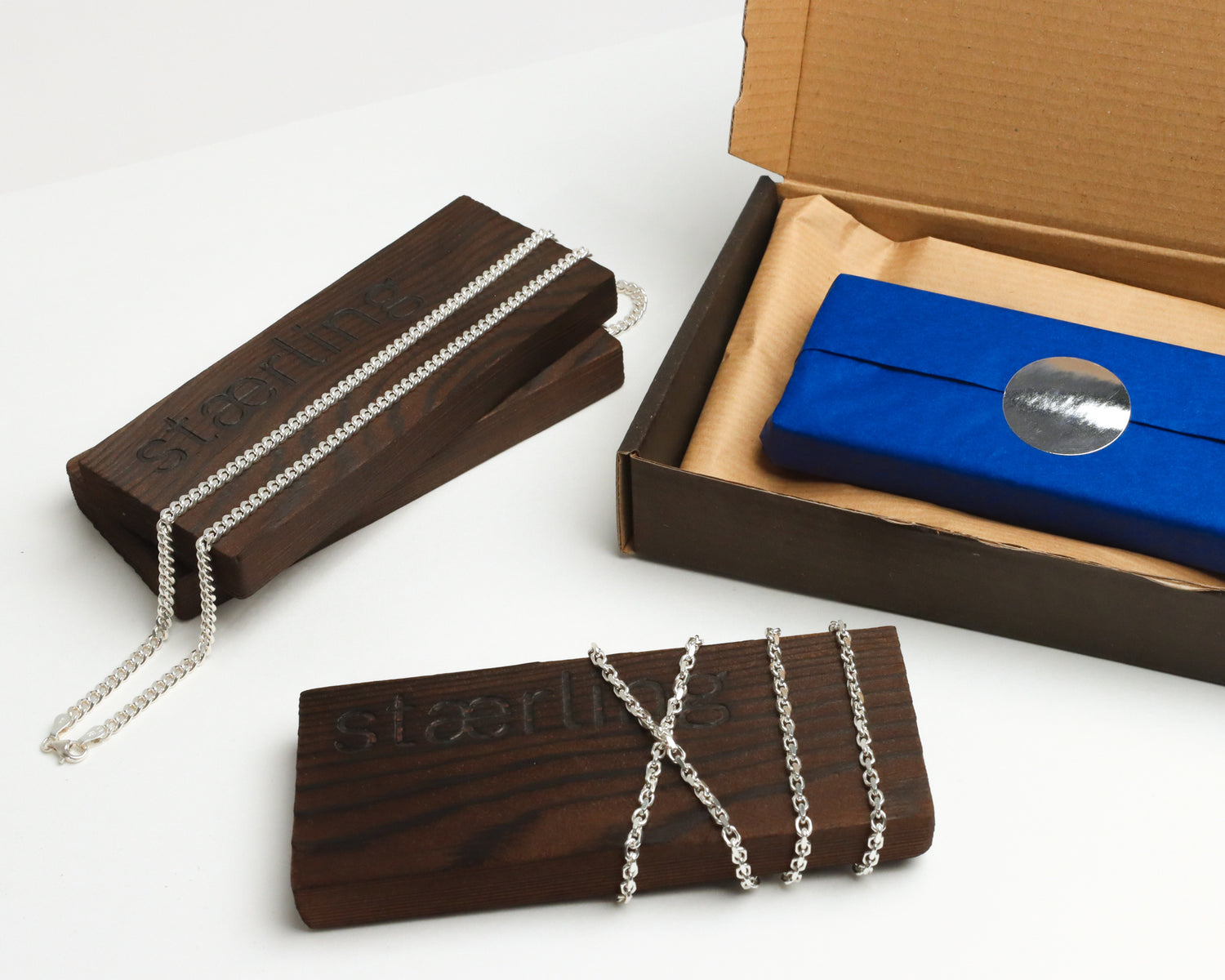 Sølvkæder fra stærling behøver ikke at blive pakket ind i vat og små fine æsker. Det er grunden til, at vores kæder leveres på shou sugi ban-brændte træklodser.